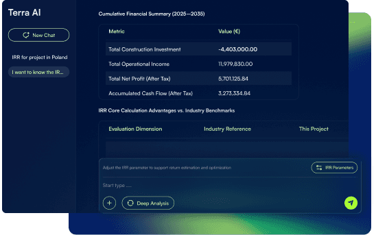 Ask questions like “What will the IRR for my BESS project in the south of Sweden be?” Get instant answers. No formulas, no spreadsheets, no waiting.